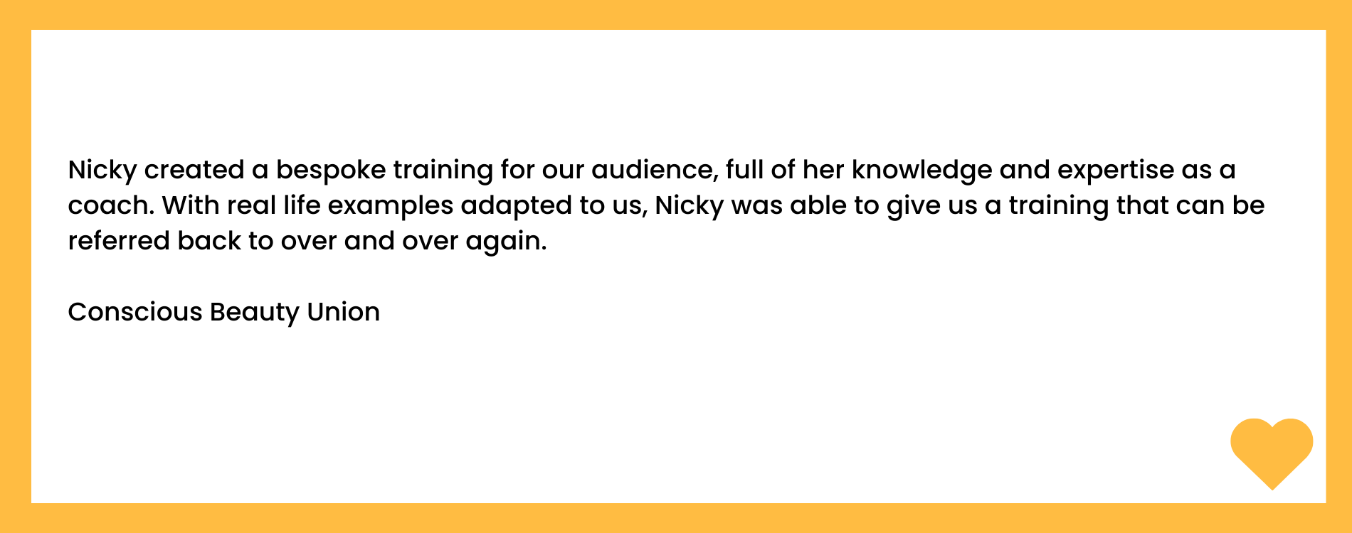 My content is flexible and can be tailored towards your audience and their requirements. You may wish to receive a presentation format, or group work, or a Q and A discussion or live coaching or a combination to suit you.