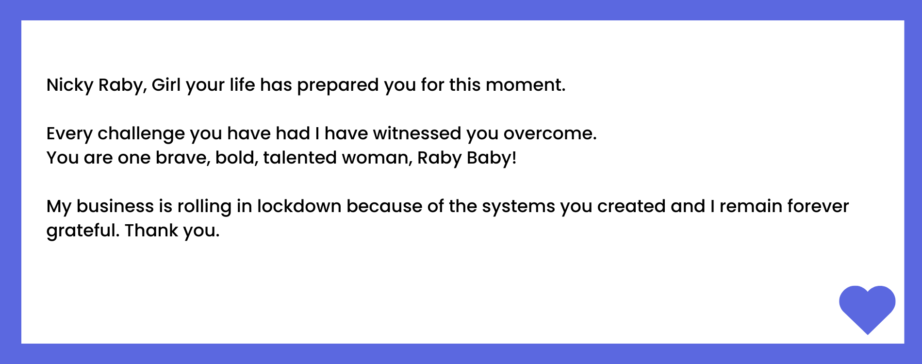 Working with Nicky was just what I needed. She created the space for me to open up and get clear on some goals that I'd been procrastinating over for way too long, and even more importantly helped me bring about some action.