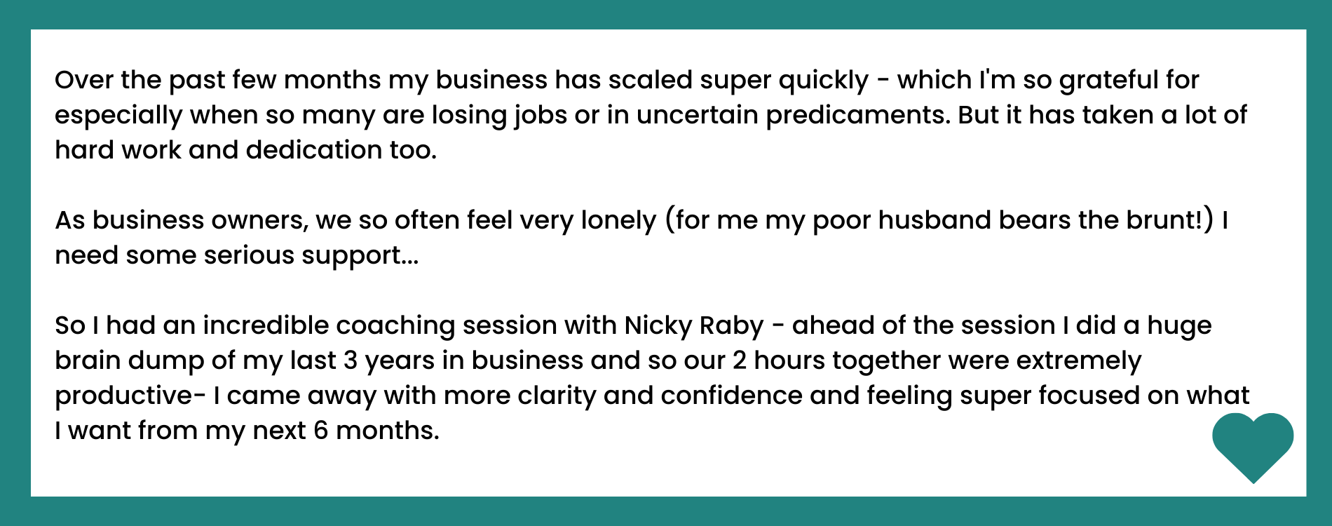 Nicky is a great coach but she also knows when to step in with ideas, which is exactly what I needed. Her creative questions, fast understanding of what you are wanting to achieve and unique background add so much value to the conversations you have with her.